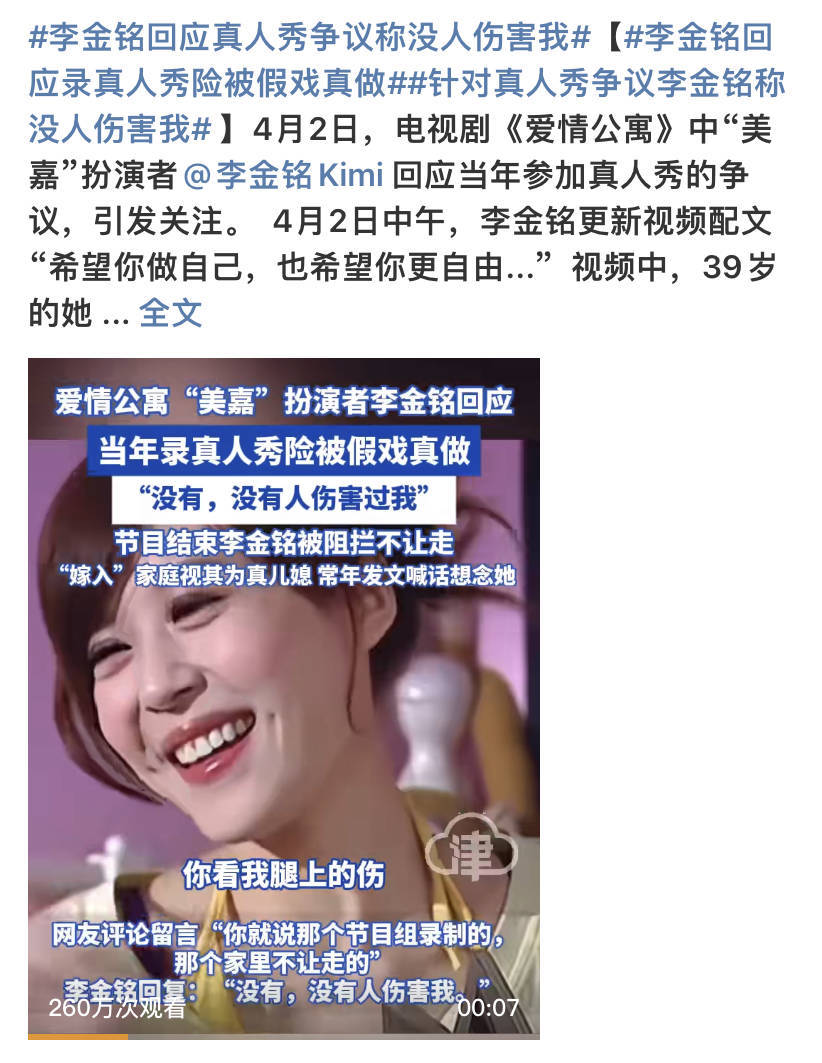时隔多年,面对网友的提问,李金铭在社交媒体上更新视频,以一句“希望你做自己,也希望你更自由...”作为配文,展现出她目前的生活状态和精神面貌。在视频中,39岁的李金铭打扮精致,状态大好,显然已经从过去的争议中走出来。对于网友关于节目中“不让走”的评论,李金铭直接而坦诚地回复:“没有,没有人伤害我。”这一回应不仅平息了部分网友的猜测,也显示出她个人对此事的释怀。