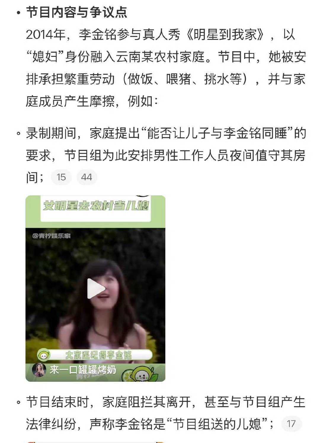 在2014年播出的《明星到我家》节目中,李金铭以“媳妇”的身份加入一个农村家庭,体验不同的生活。然而,节目中的某些情节,如被安排做大量家务、言语冲突以及离开时的“不让走”场景,曾引起广泛争议。许多观众认为李金铭在节目中受到了不公正的对待,甚至有人质疑节目的真实性和道德标准。